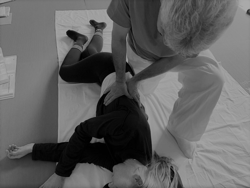 Shiatsu wird am bekleideten Menschen auf einer Matte auf dem Boden ausgeübt.